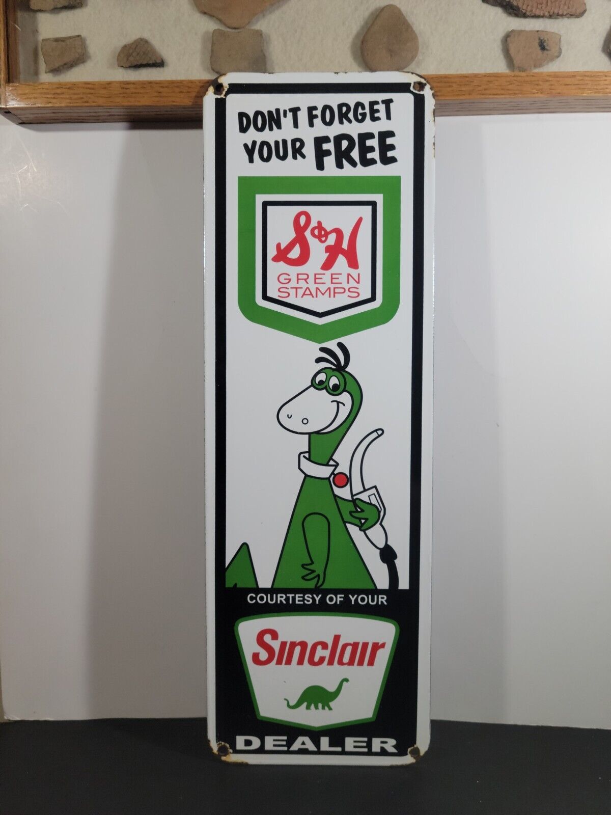 VINTAGE PORCELAIN SINCLAIR GASOLINEDINO SH GREEN STAMPS ADVERTISING 22X7inSIGN