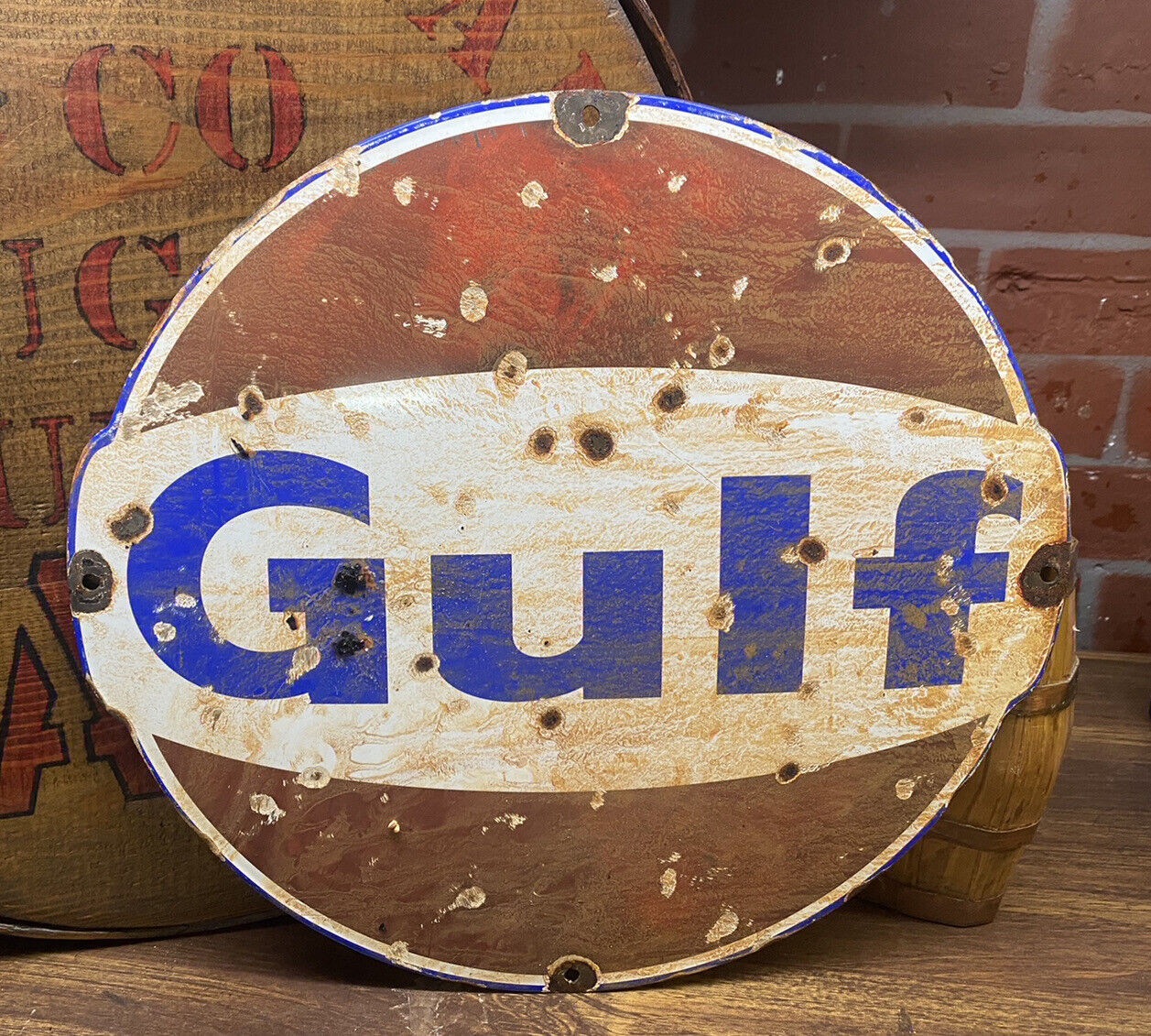 Large 14” GULF Service Station Oil Gas ⛽️ Pump Plate Porcelain Metal Sign