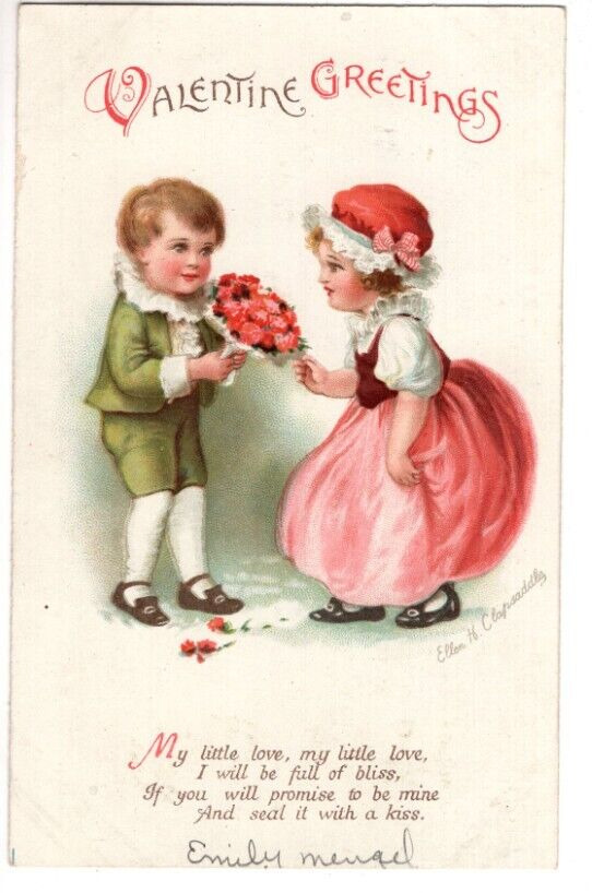 Title (ebay affiliate link): ANTIQUE VALENTINE Postcard ELLEN CLAPSADDLE BOY HANDING BOUQUET TO GIRL