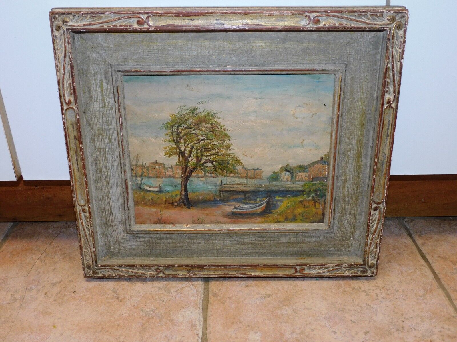 ANTIQUE ORIGINAL IMPRESSIONISM LANDSCAPE RIVER FISHING BOATS OIL ON BOARD FRAM