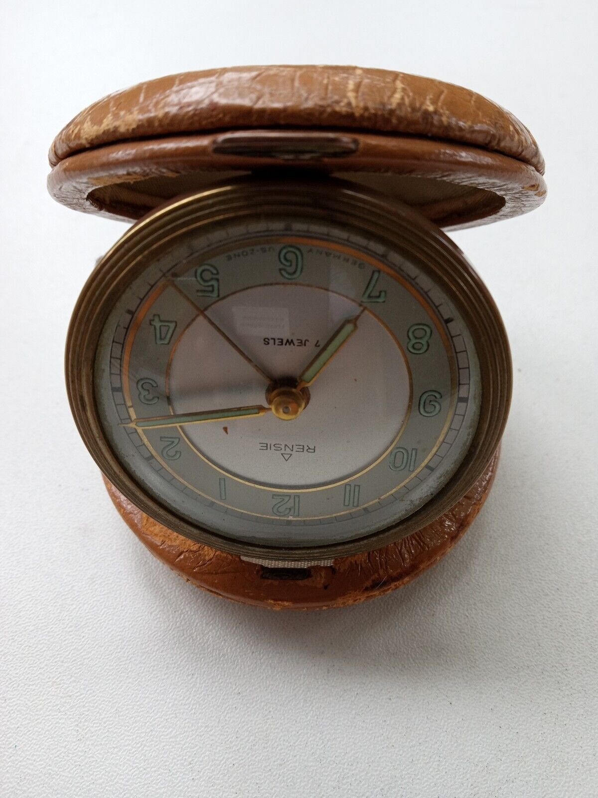 Title (ebay affiliate link): Vtg Rensie 7 Jewels Travel Alarm Clock with Leather Case Wind Up Germany Works