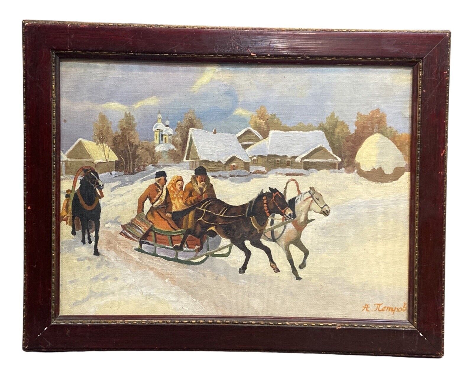 Title (ebay affiliate link): Vintage RUSSIAN WINTER SCENE Old HORSE SLEIGH SNOW Landscape FOLK ART PAINTING