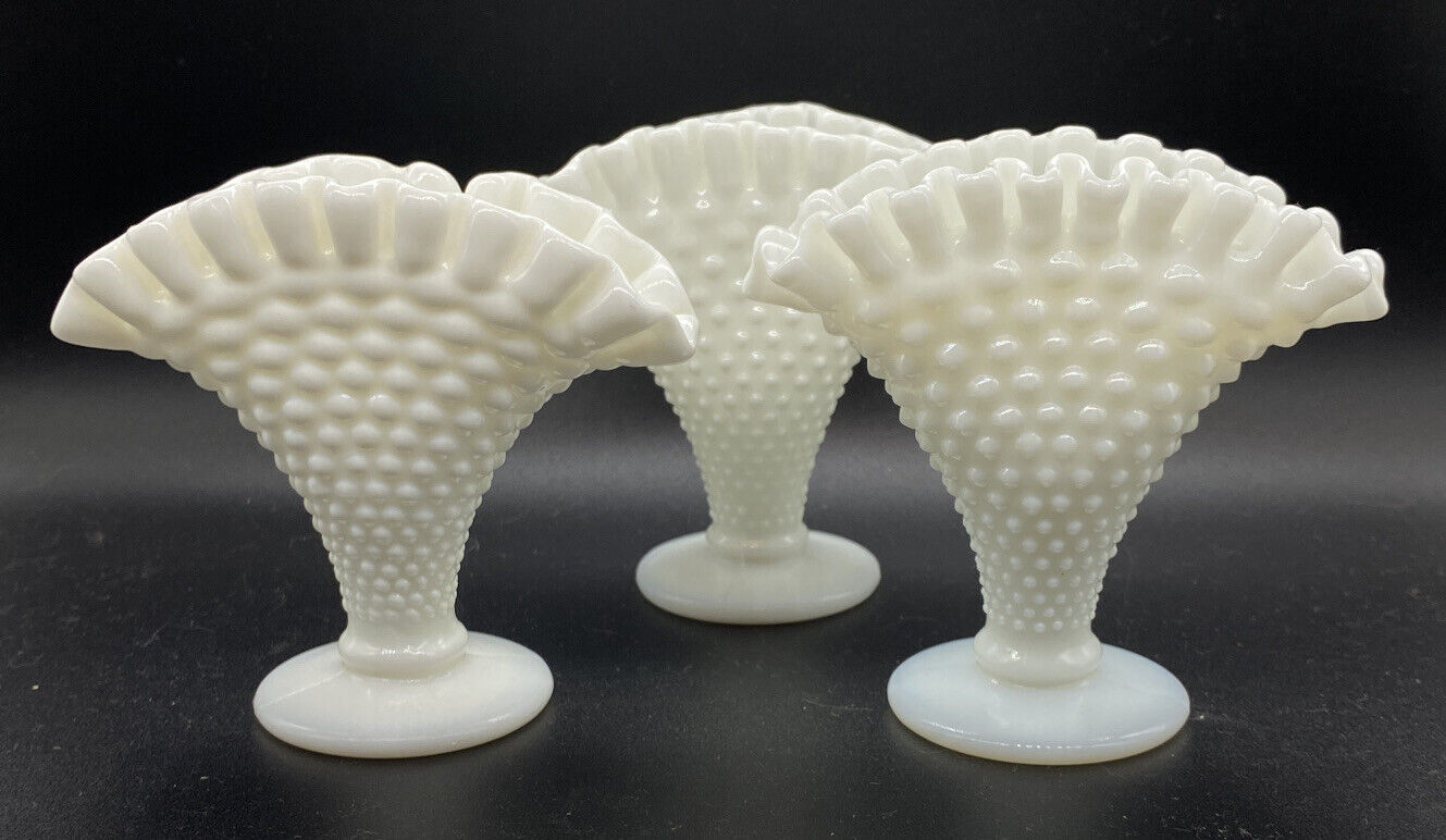 Title (ebay affiliate link): Set Of 3 Vintage Fenton Sm Fan Vases Hobnail Milk Glass Ruffled/Crimped Edge