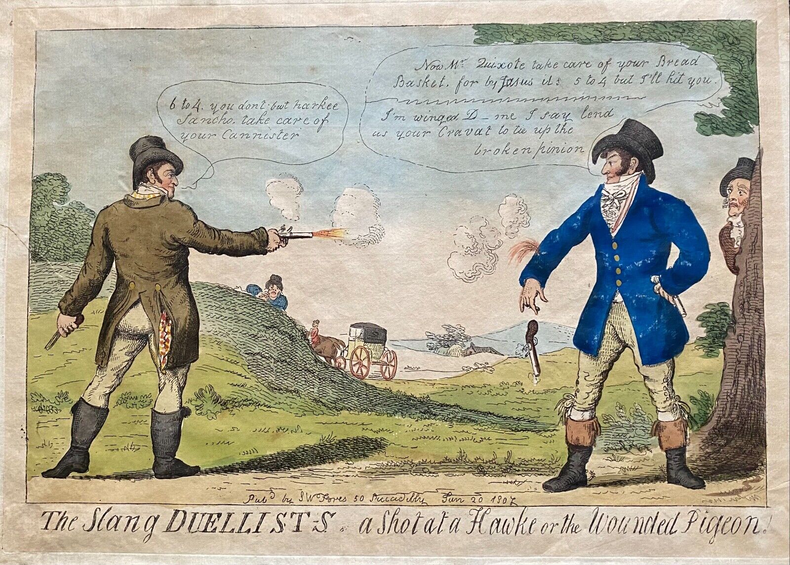 Title (ebay affiliate link): 1802 ENGLISH ENGRAVED HAND COLORED CARTOON of 34DUELLISTS34 Slang Language