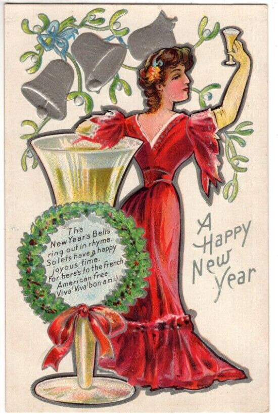 Title (ebay affiliate link): ANTIQUE EMBOSSED NEW YEAR Postcard LADY HOLDING CHAMPAGNE GLASS WREATH BELLS