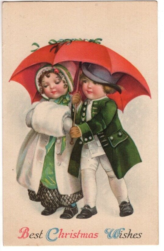 Title (ebay affiliate link): ANTIQUE CHRISTMAS Postcard YOUNG BOY AND GIRL IN GREEN AND WHITE UMBRELLA