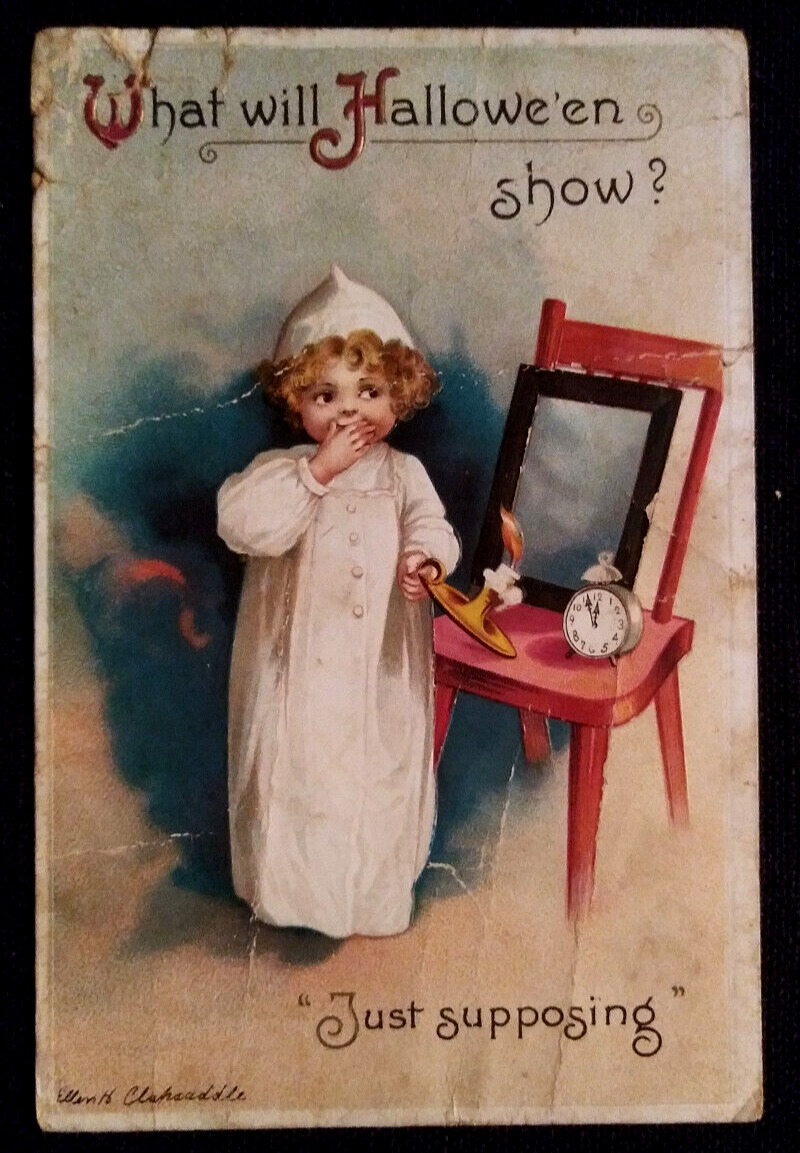 1910 Antique Halloween postcard A/S Clapsaddle little girl with candle