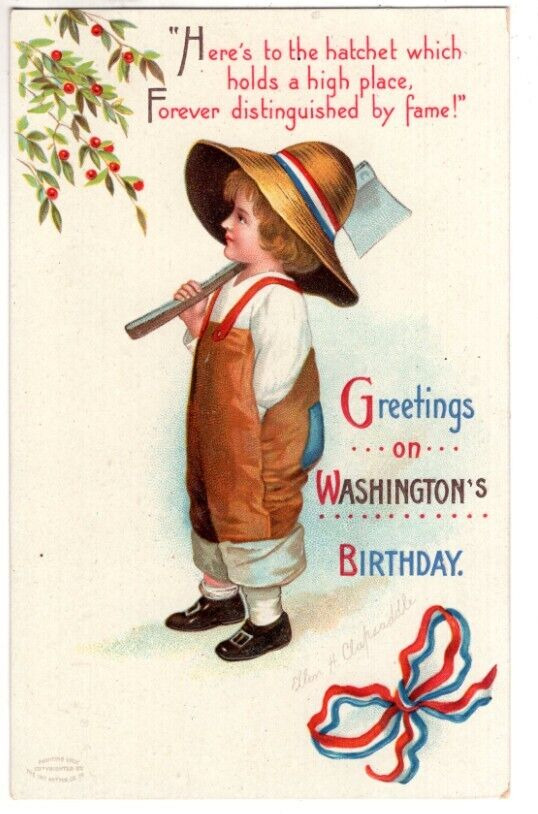 Title (ebay affiliate link): ANTIQUE PATRIOTIC Postcard ELLEN CLAPSADDLE YOUNG BOY HATCHET OVER SHOULDER