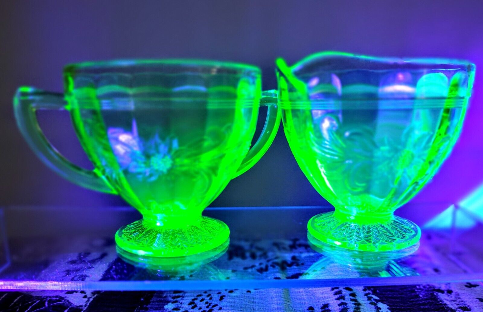 Jeanette Green Depression Glass Sunflower Uranium Glass Sugar Creamer 1930s