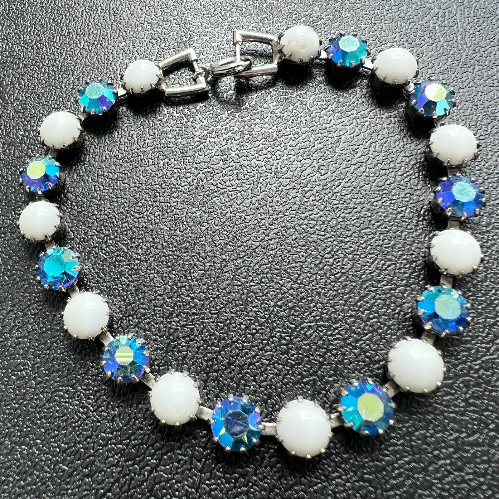 A789 Unsigned WEISS Vintage Sapphire Blue AB Rhinestone Milk Glass Bracelet