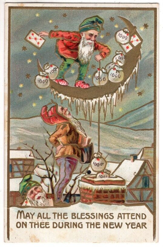 ANTIQUE NEW YEAR Postcard GNOME ON MOON DROPPING MONEY BAG DOWN CHIMNEY