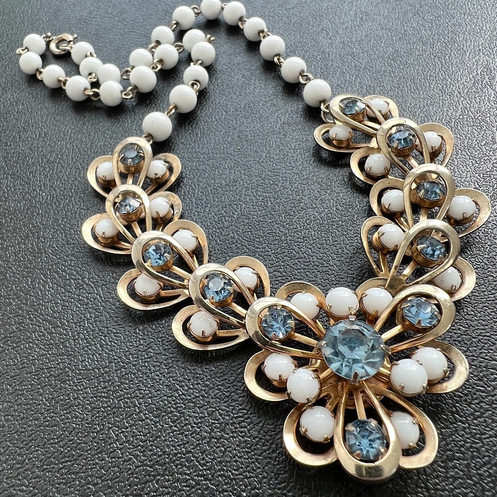A696 Vintage White Milk Glass Cabochon Topaz Blue Rhinestone Flower Necklace