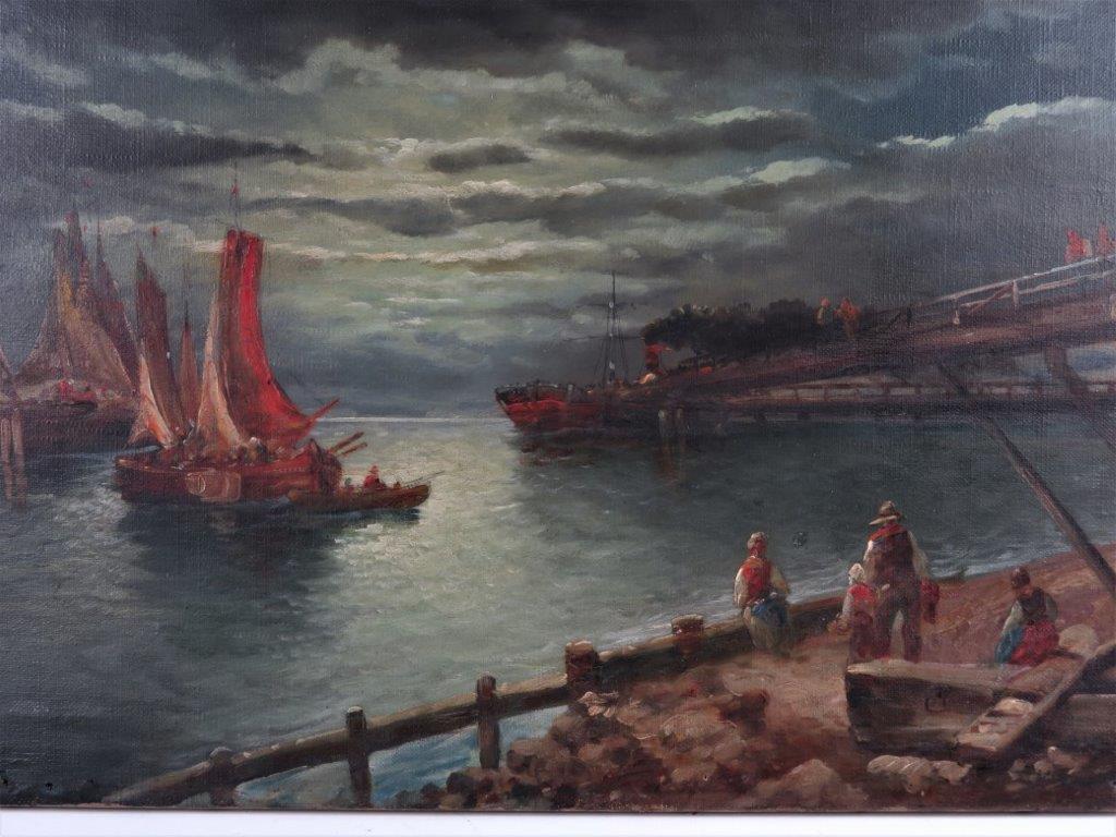 antique oil on canvas F. Hartrout ships in harbor 1900