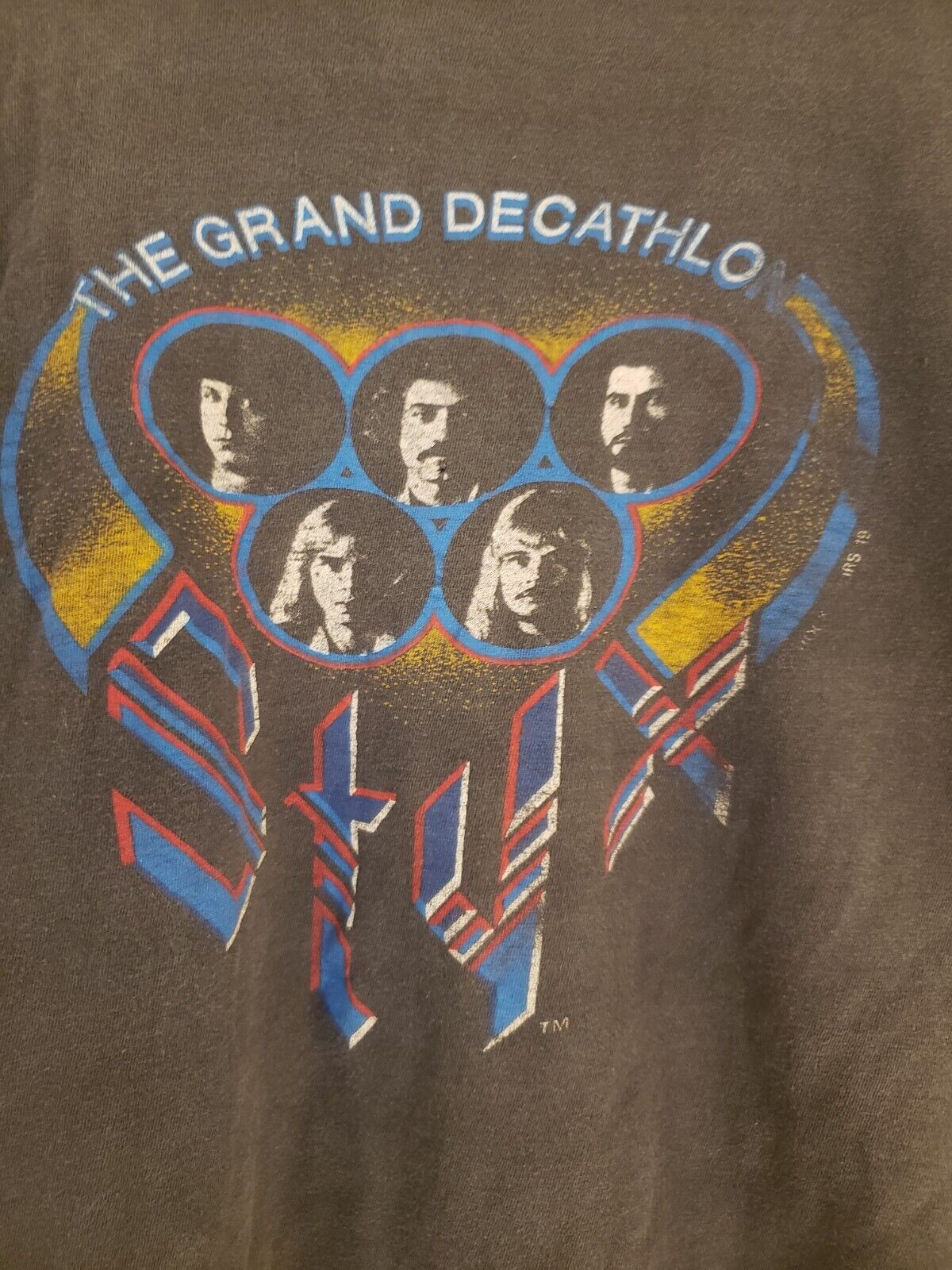 Title (ebay affiliate link): Vintage Styx 1970s The Grand Decathlon American Tour Double Sided Concert Shirt