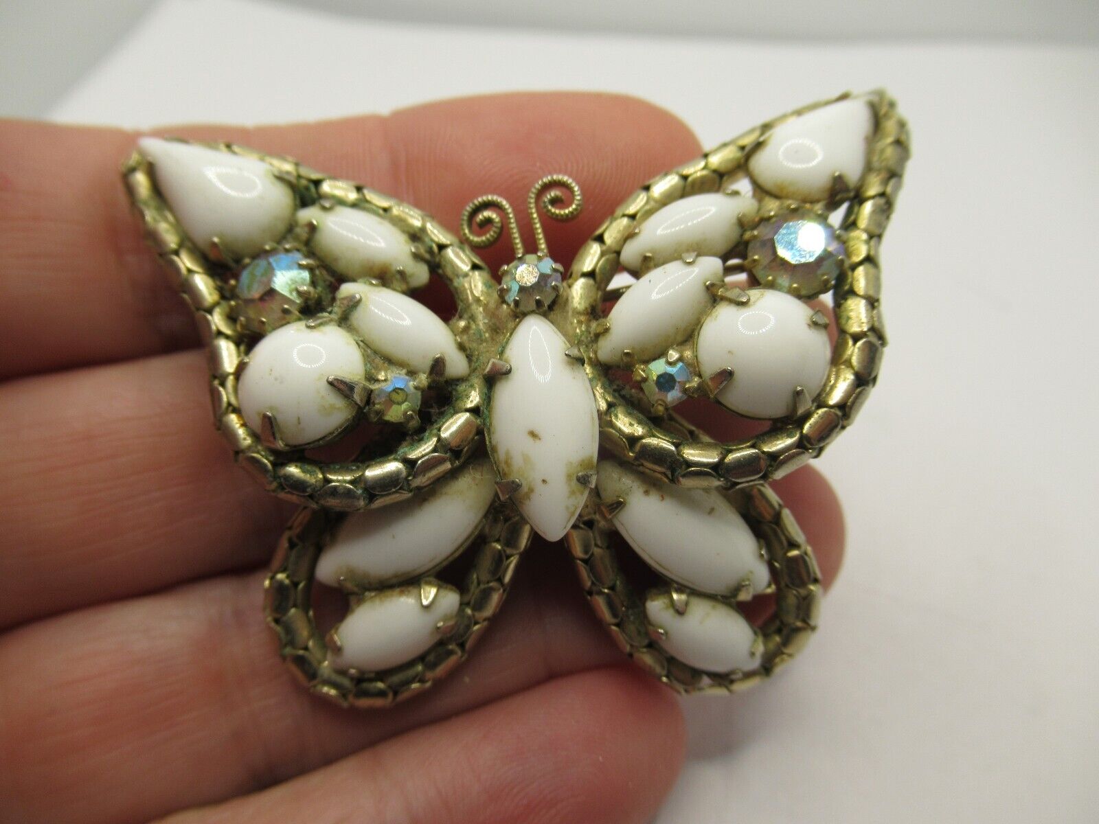 Title (ebay affiliate link): VINTAGE JULIANA MILK GLASS AB RHINESTONE NAVETTE GOLD TONE BUTTERFLY BROOCH
