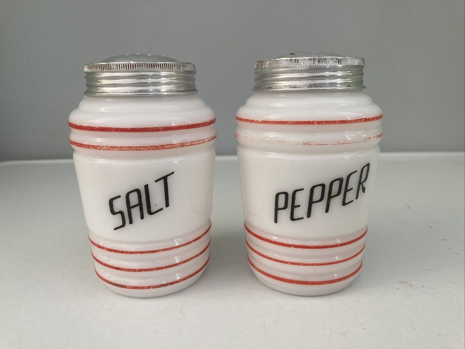 Vintage Hazel Atlas White Beehive Milk Glass Salt/Pepper Shaker Red Trim