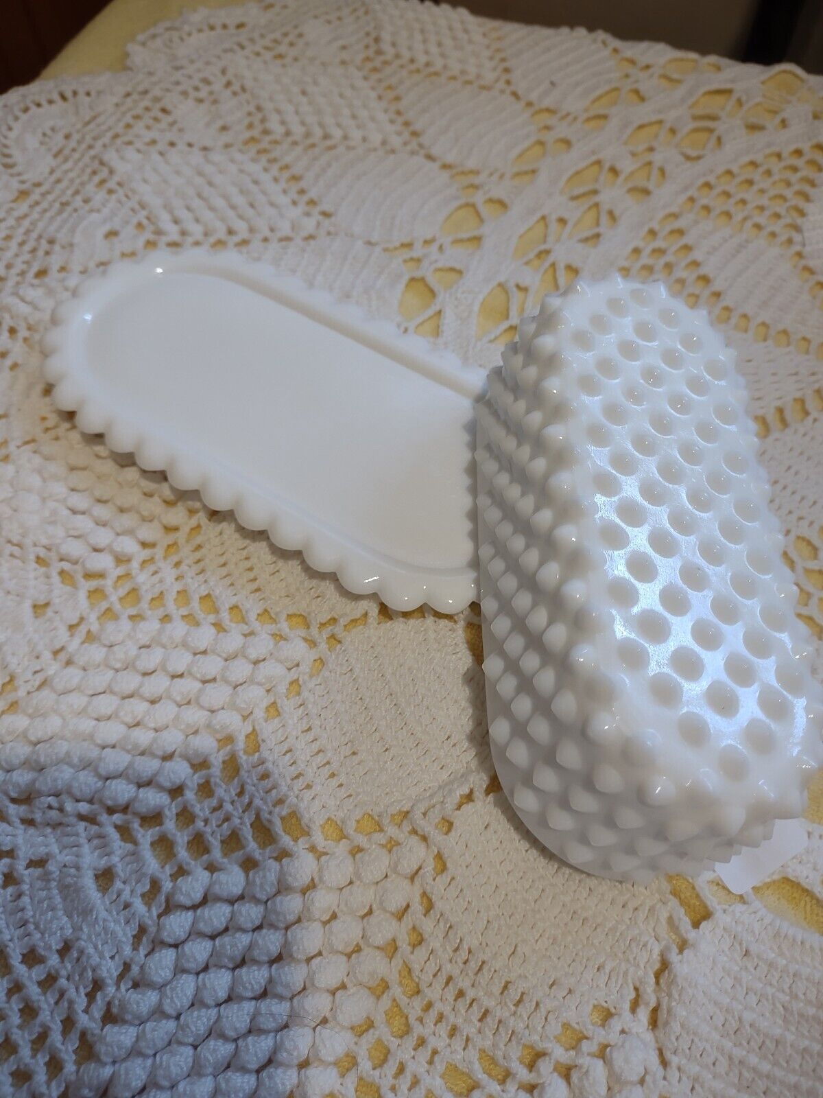 Vintage 1960s To 1970s Fenton White Milk Glass. Hobnail Butter Dish scalloped