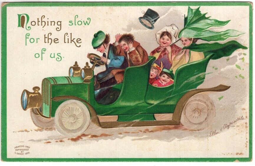 ANTIQUE ST. PATRICKS DAY Postcard ELLEN CLAPSADDLE RIDERS IN CAR SPEEDING