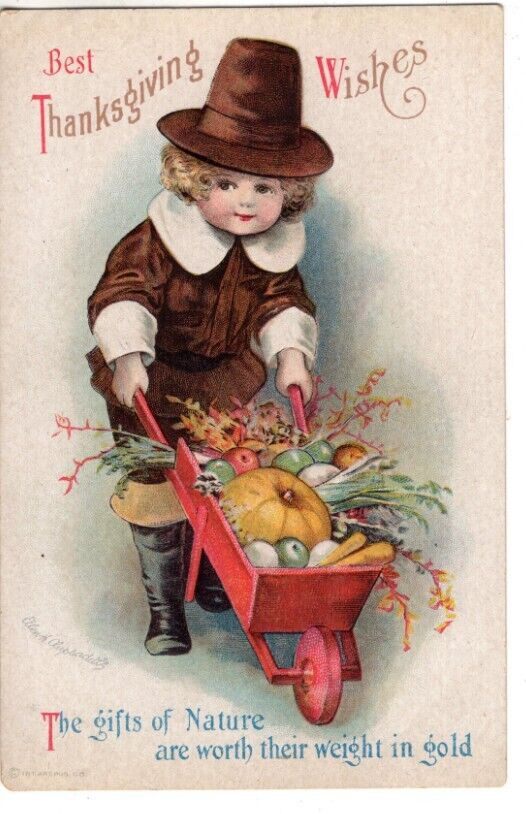 Title (ebay affiliate link): ANTIQUE THANKSGIVING Postcard ELLEN CLAPSADDLE PILGRIM BOY WHEELBARROW