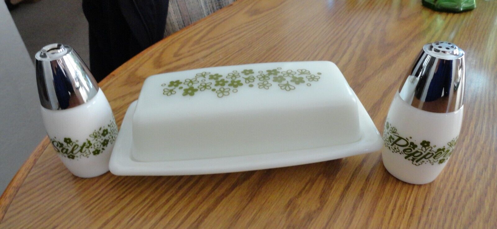 Title (ebay affiliate link): Vintage Pyrex Milk Glass Crazy Daisy Butter Dish Salt Pepper Shakers Green Flo