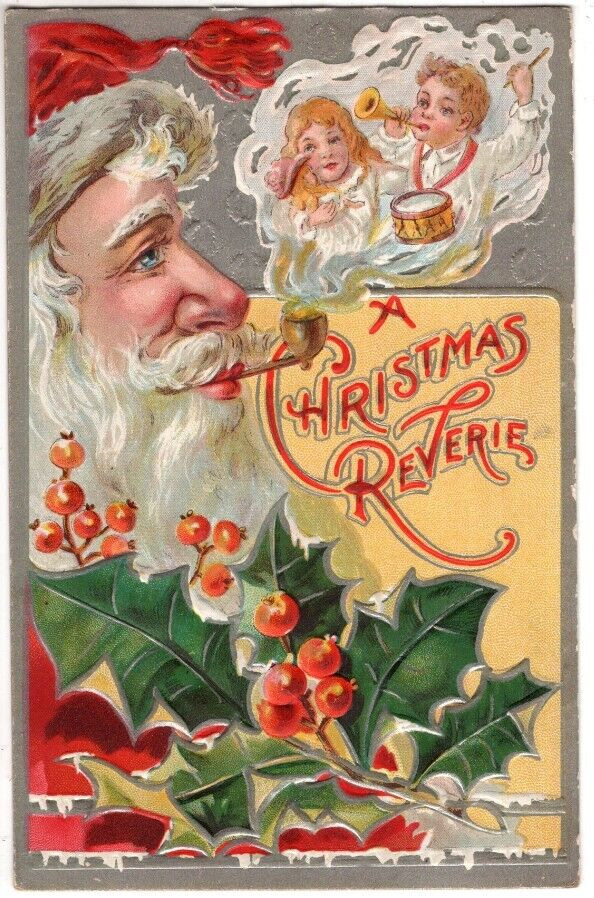 Title (ebay affiliate link): ANTIQUE EMBOSSED CHRISTMAS Postcard 34A CHRISTMAS REVERIE34 SANTA CLAUS PIPE