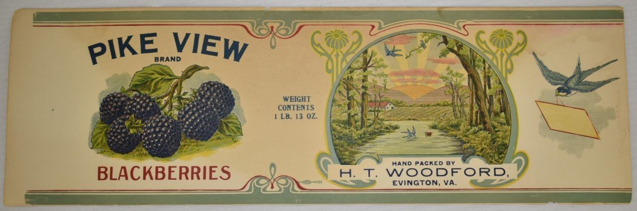 Vintage Can Label Pike View brand Blackberries H.T. Woodford Evington VA