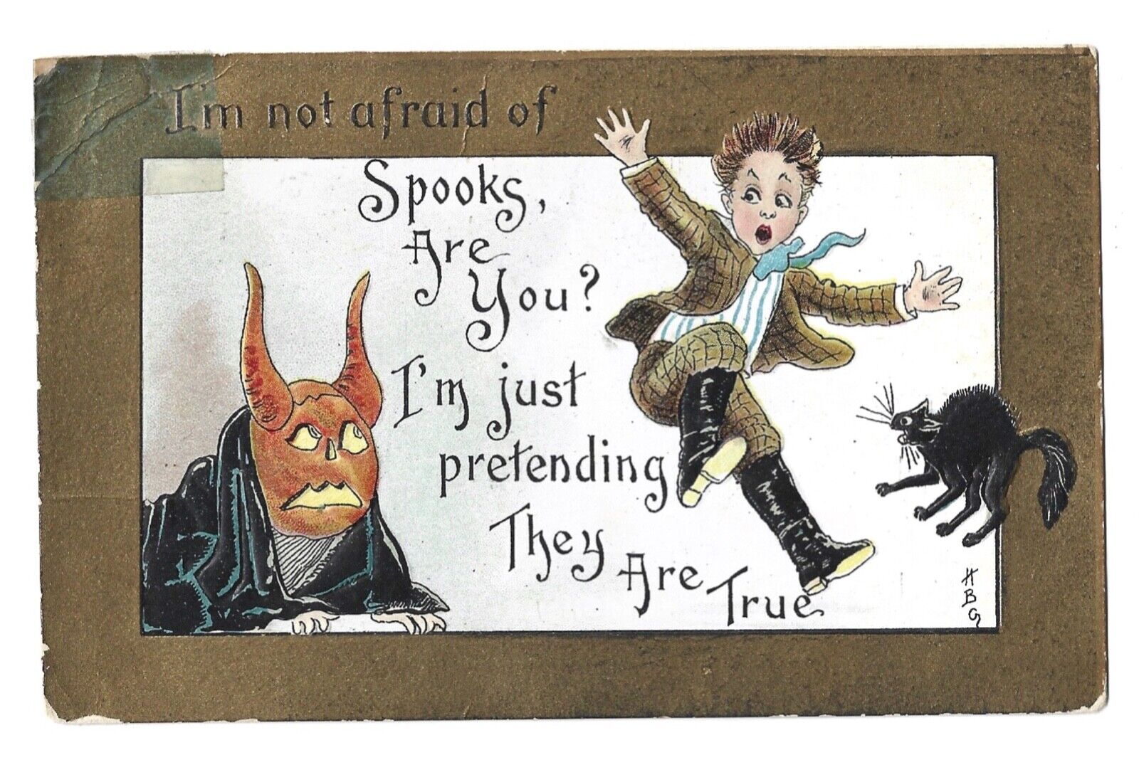 ANTIQUE 1910 HALLOWEEN GOBLIN AND BOY POSTCARD WITH HBG ON IT