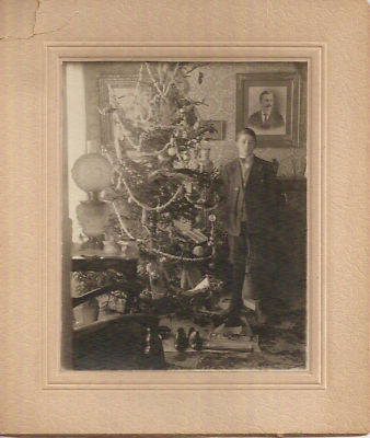 Title (ebay affiliate link): Real Photo Xmas Scene. Boy in Suit, New Shoes, Toys, et