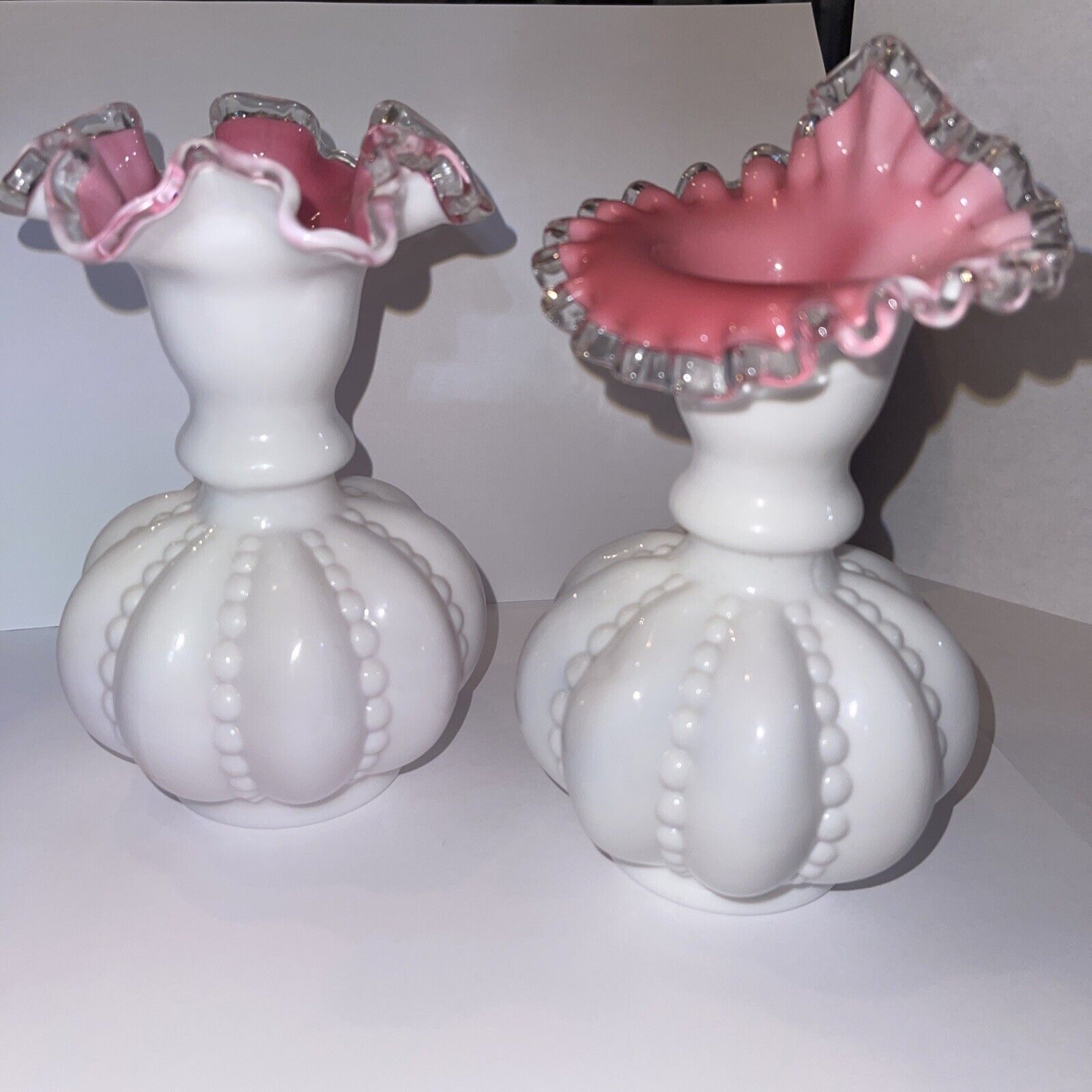 Fenton White Hobnail Milk Glass Crimped Ruffled Vase Peachblow Pink Interior
