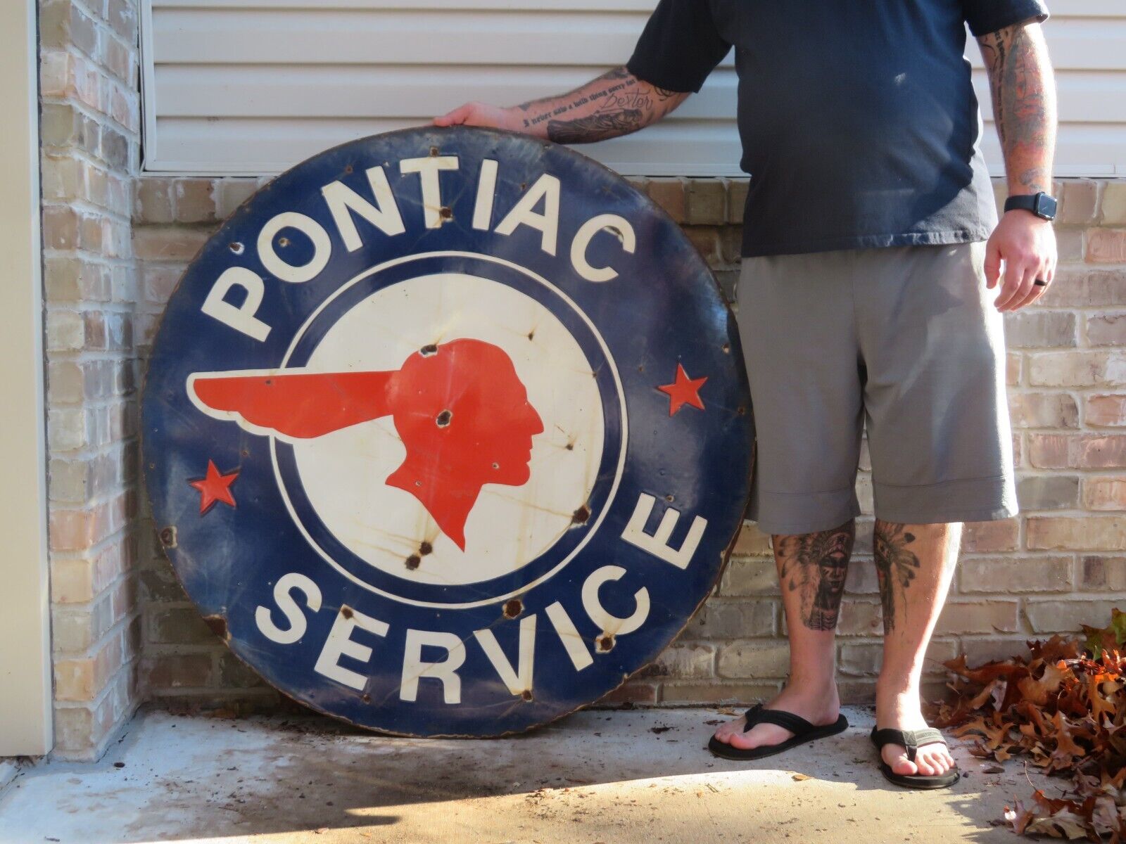 PORCELAIN PONTIAC SERVICE SIGN OLD ORIGINAL GAS OIL DOUBLE SIDED LARGE 42 INCHES