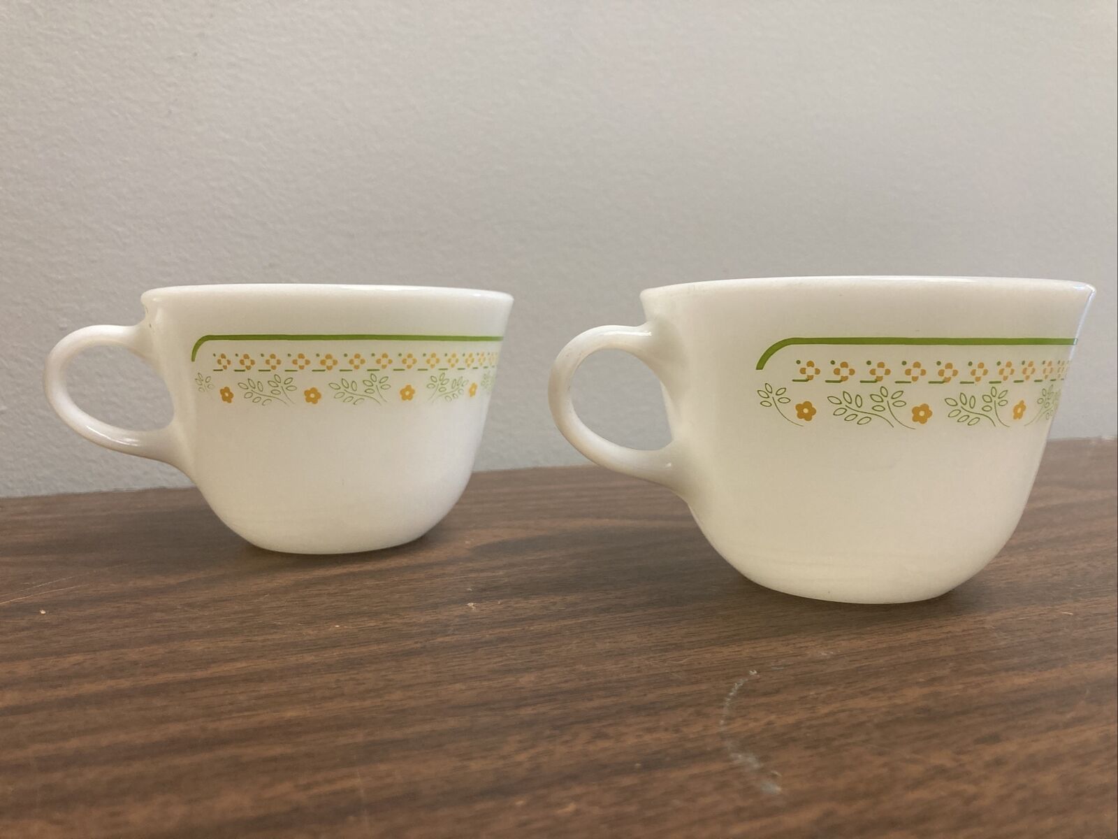Title (ebay affiliate link): Vintage Pyrex milk glass Tea Cups Set of 2green vine/leaves yellow flower