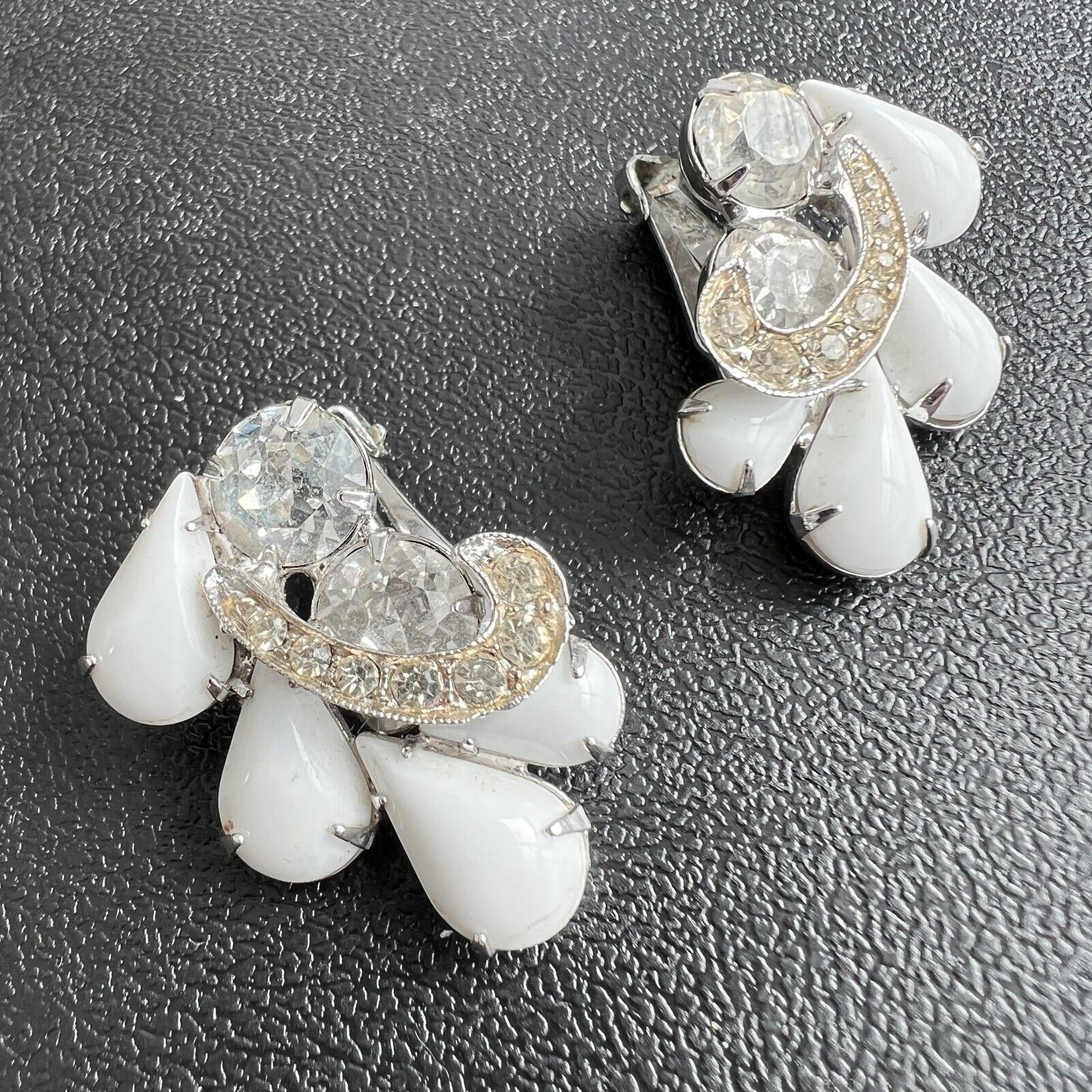 Title (ebay affiliate link): A333 Signed WEISS Vintage White Milk Glass Flower Crystal Clip Earrings