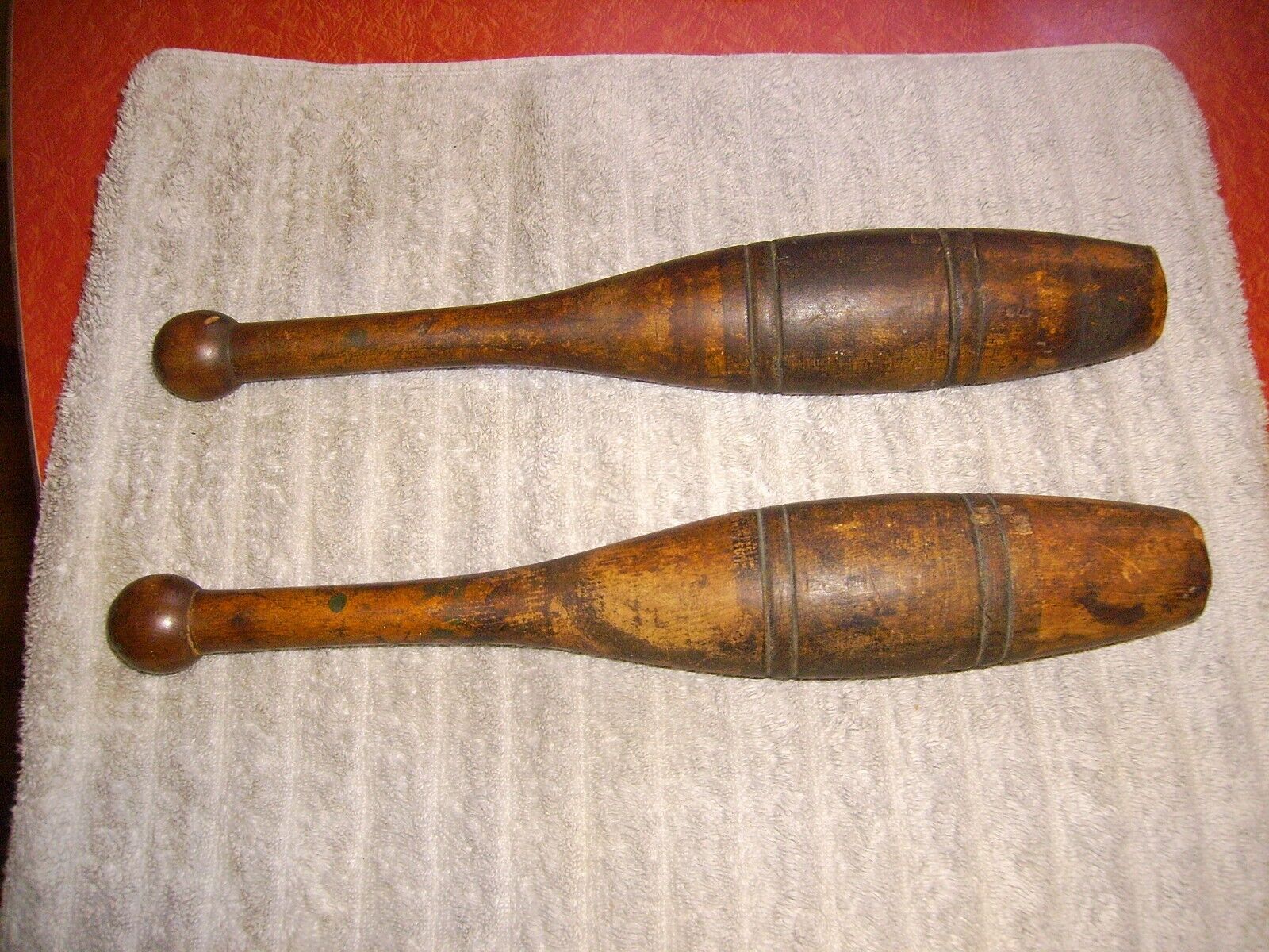 ANTIQUE WOODEN INDIAN EXERCISE JUGGLING CLUBS RARE 1334 1/2 LB EA 2 CLUBS