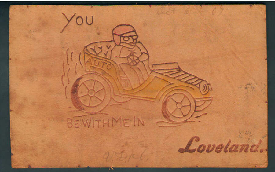 1907 Antique LEATHER Postcard YOU BE WITH ME IN LOVELAND Old Automobile