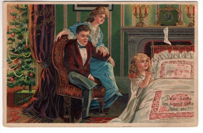 Title (ebay affiliate link): ANTIQUE EMBOSSED CHRISTMAS Postcard CHILD PRAYING BESIDE BED PARENTS WATCHING