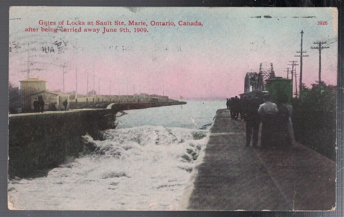 ANTIQUE 1909 DISASTER SHIP CARRIES AWAY SAULT STE. MARIE LOCKS CANADA POSTCARD