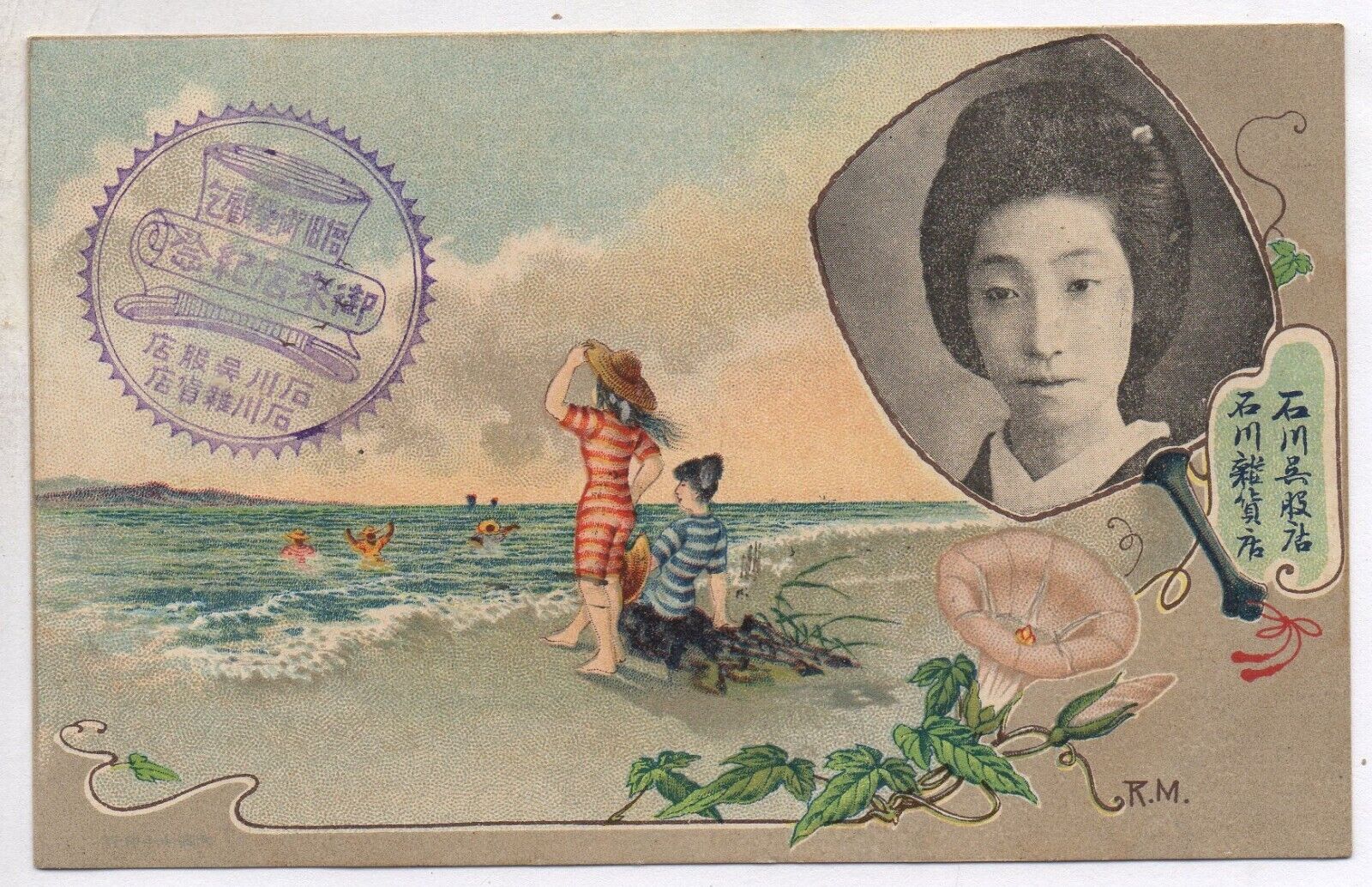 JAPAN/ ANTIQUE POSTCARD/ BATHING BEAUTIES/ STORE ADVERT FROM ISHIKAWA