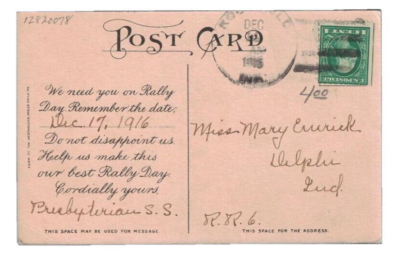 ANTIQUE 1916 SUNDAY SCHOOL RALLY DAY KIDS DELPHI INDIANA POSTCARD