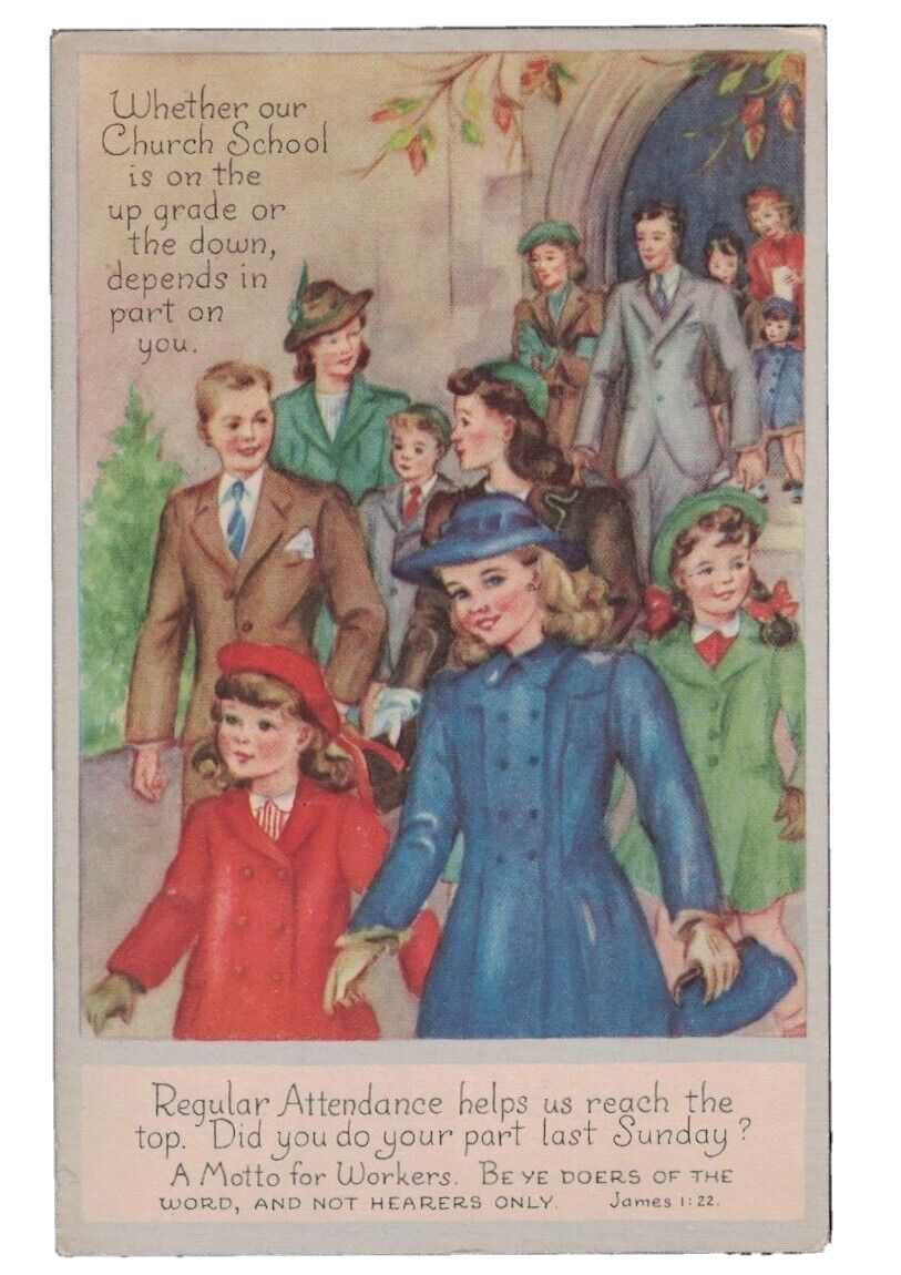 ANTIQUE 1920S SUNDAY SCHOOL RALLY DAY FAMILIES LEAVING CHURCH UNUSED POSTCARD
