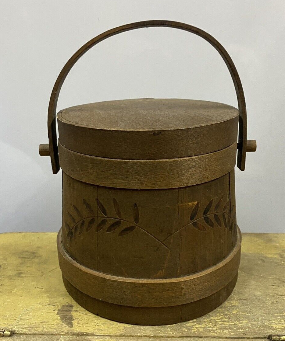 Small 534 FIRKIN PANTRY BOX Primitive Vtg Antique Pail Sugar Bucket Treen w/Wheat