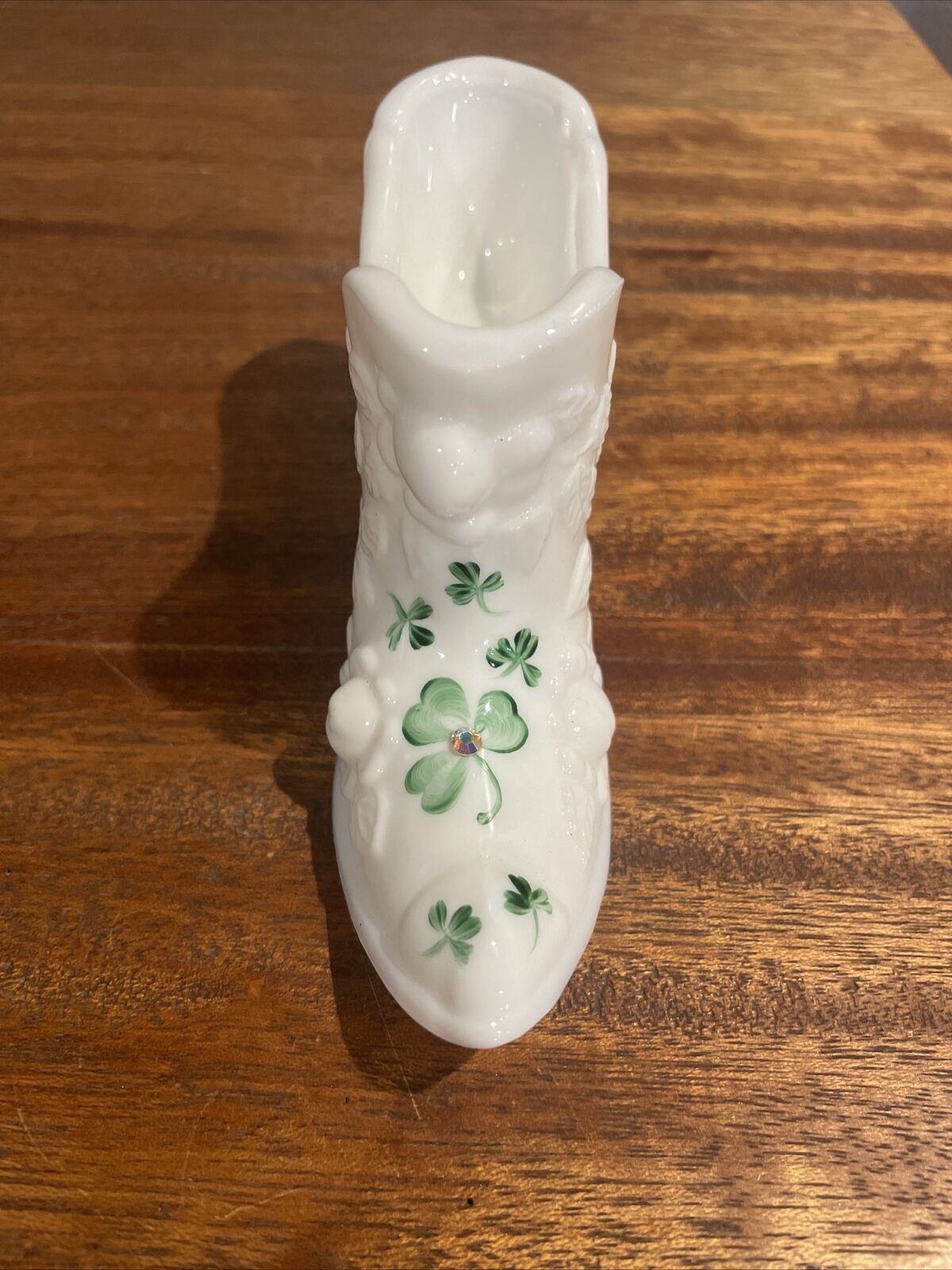 Title (ebay affiliate link): FENTON WHITE ART GLASS SHOE W/ HAND PAINTED SHAMROCKS SIGNED BY ARTIST