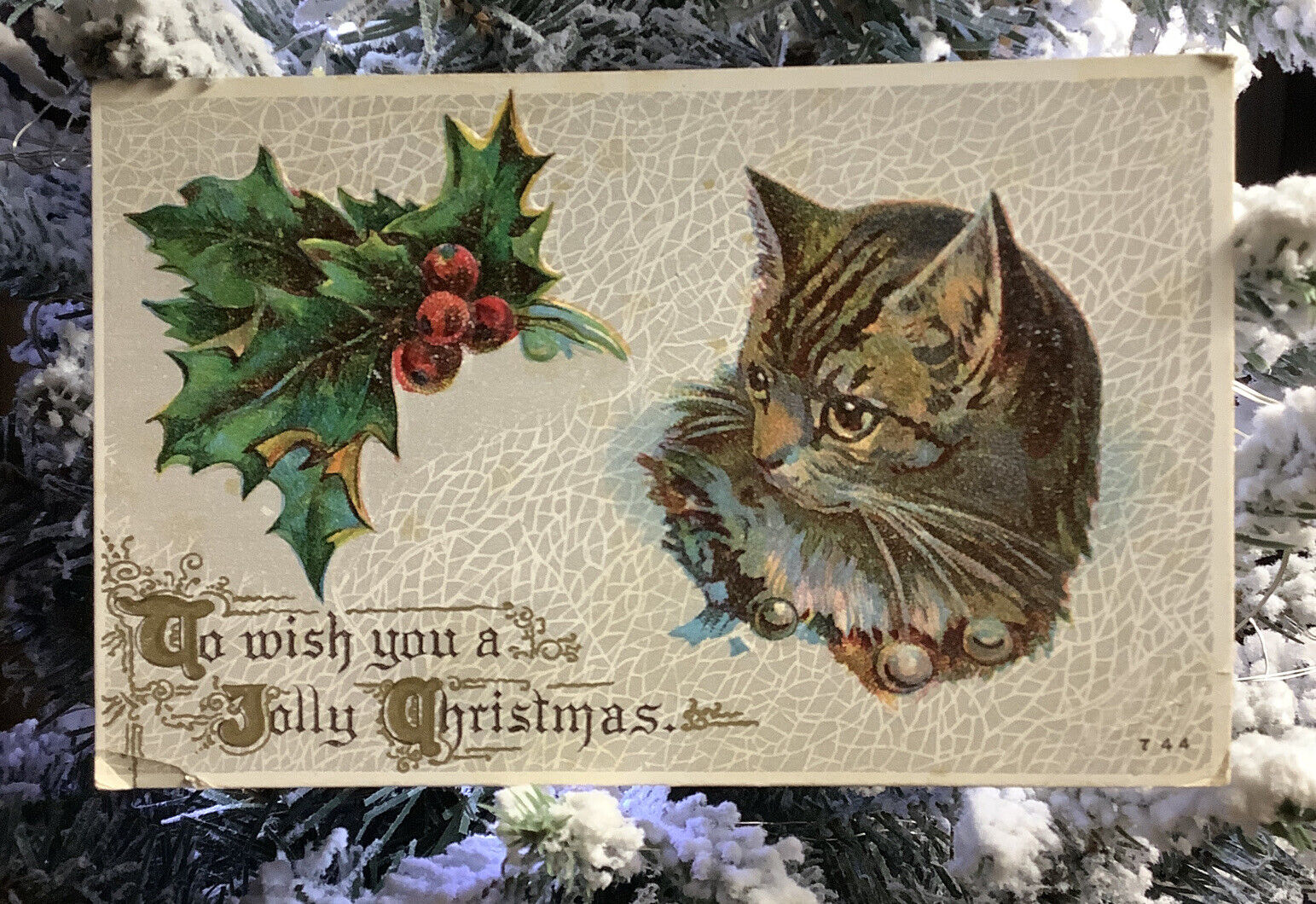 Title (ebay affiliate link): Vintage cat Christmas postcard antique kitten with bells on Holly embossed