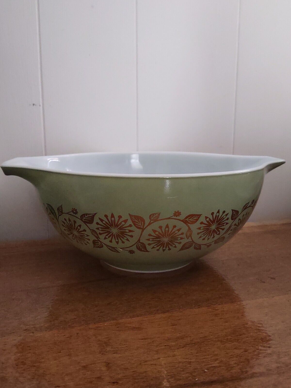 Title (ebay affiliate link): Vintage Pyrex Sage Green Gold Medallion Cinderella 2 1/2 Qt Mixing Bowl 443