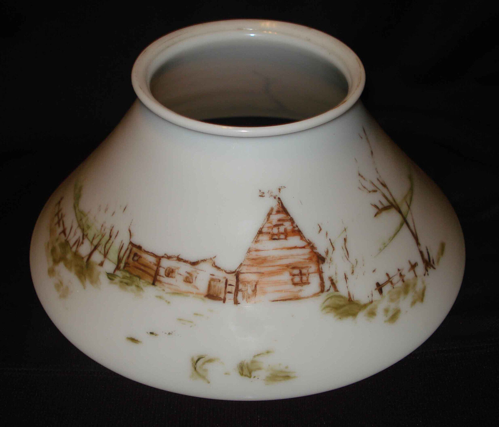 Vintage White Milk Glass Hand Painted Cabin Trees Oil Kerosene Lamp Shade Globe