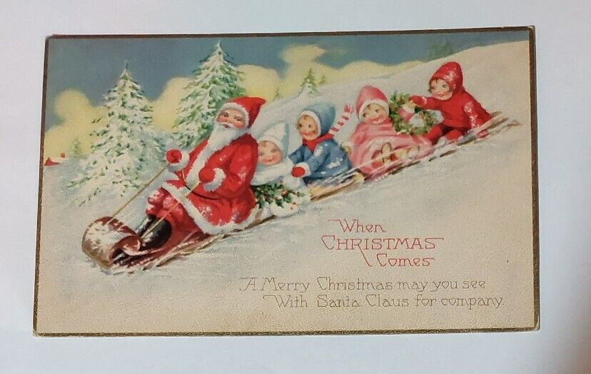 Title (ebay affiliate link): Antique Santa Sledding w/Children When Christmas Comes Postcard 1135C unposted