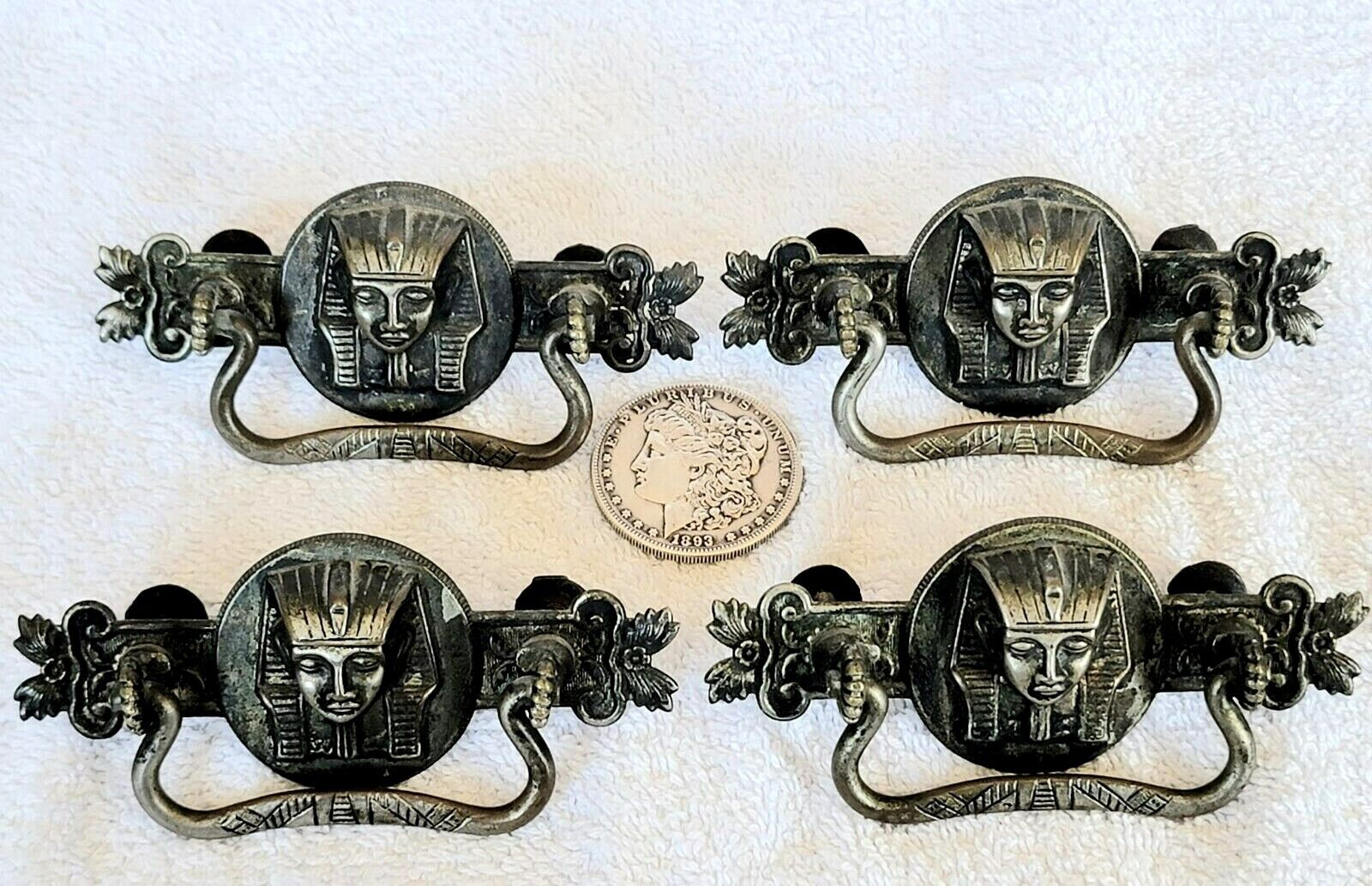 LOT of 4 Egyptian Revival Drawer Pull Handles 1880s Pressed Metal w Pharaoh