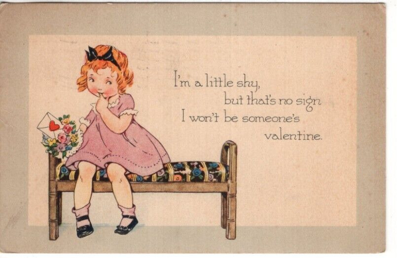 ANTIQUE VALENTINE Postcard SHY YOUNG GIRL RED HAIR LOOKING FOR VALENTINE