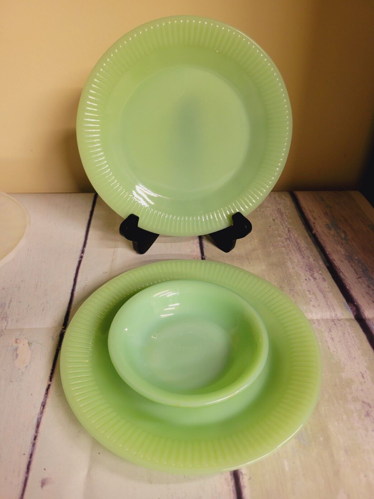 Title (ebay affiliate link): 2 FIRE KING JADEITE JANE RAY SALAD PLATES BERRY BOWL ANCHOR HOCKING