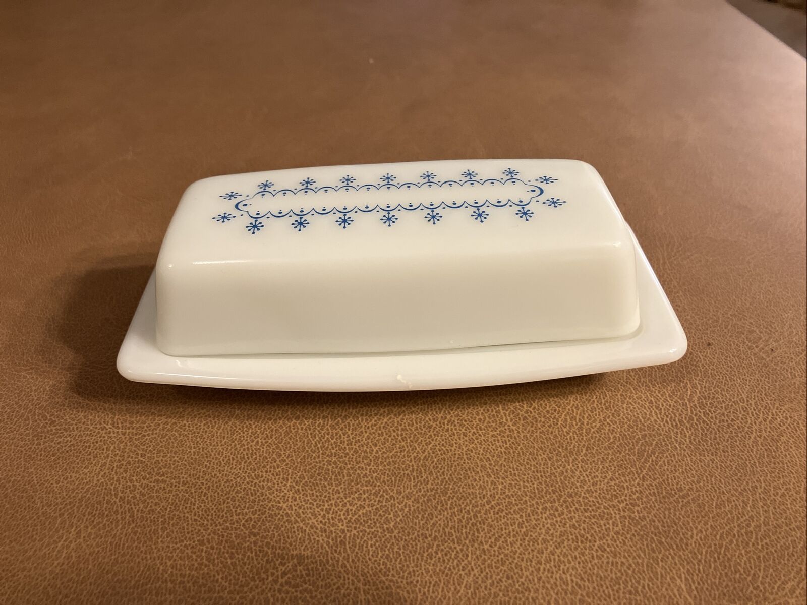 Vintage Pyrex Glass Butter Dish with Lid Snowflake Blue on White Garland