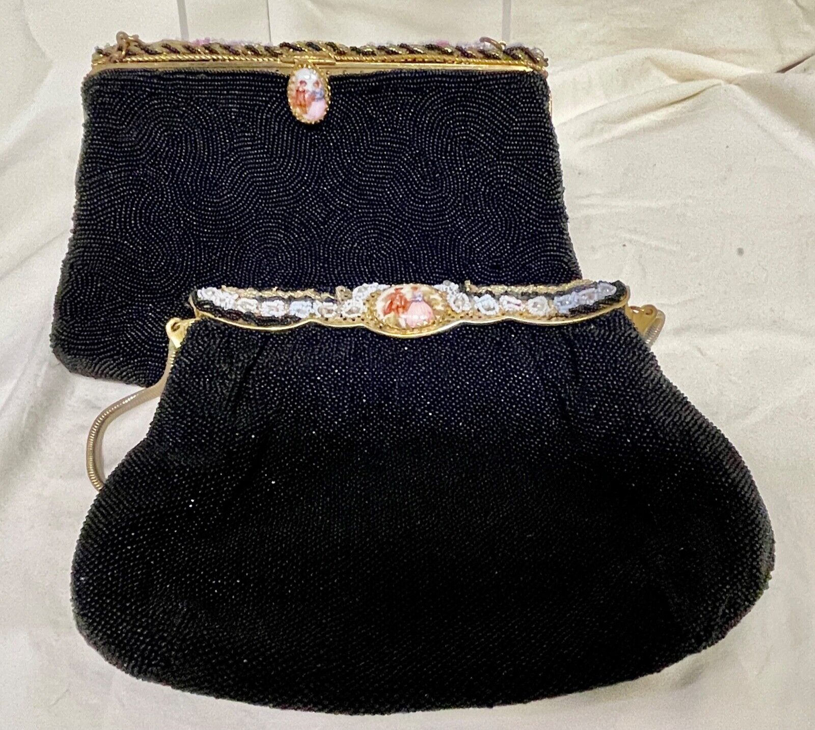 Title (ebay affiliate link): 2 Vintage French Beaded Purses with Porcelain Plaques Labelled Walborg and Kams